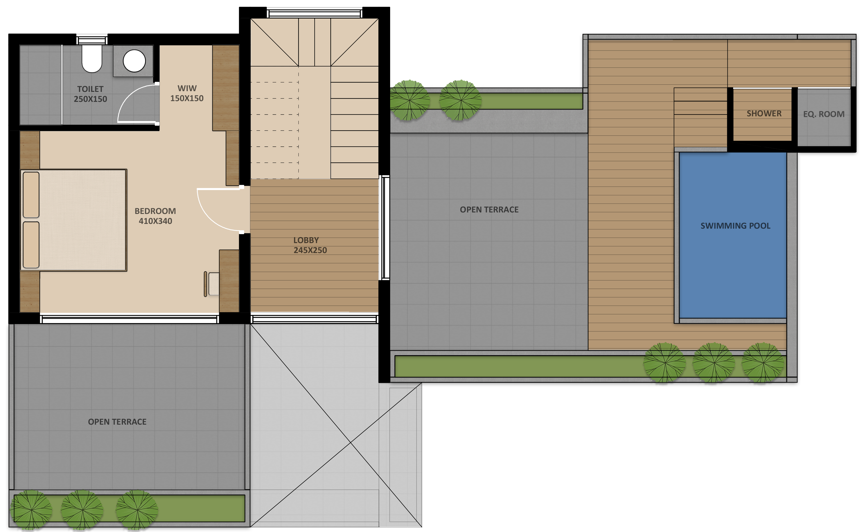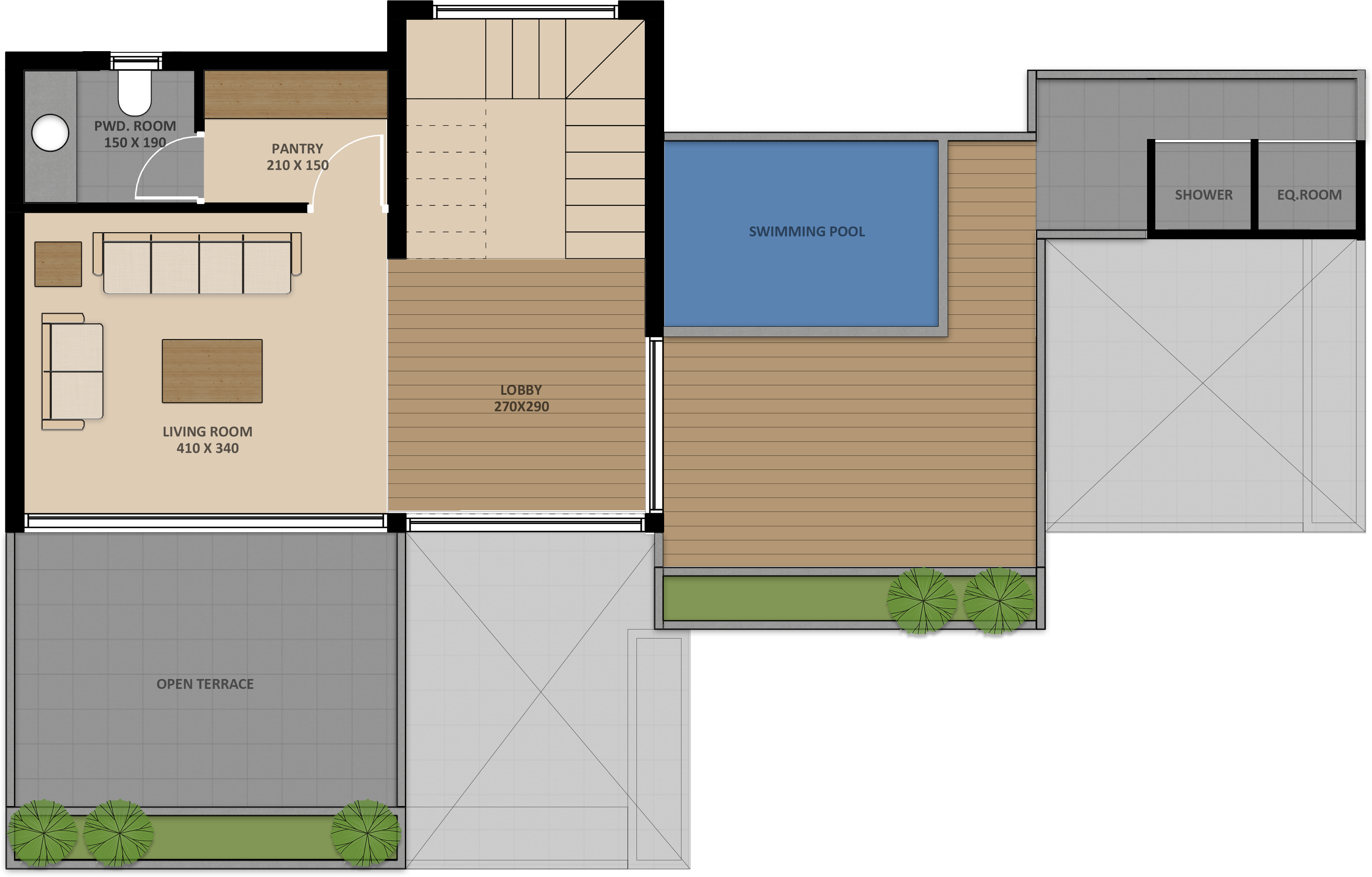 - Self-irrigated terrace garden and Pool at second floor. Pool deck with Anti-skid floor tiles.